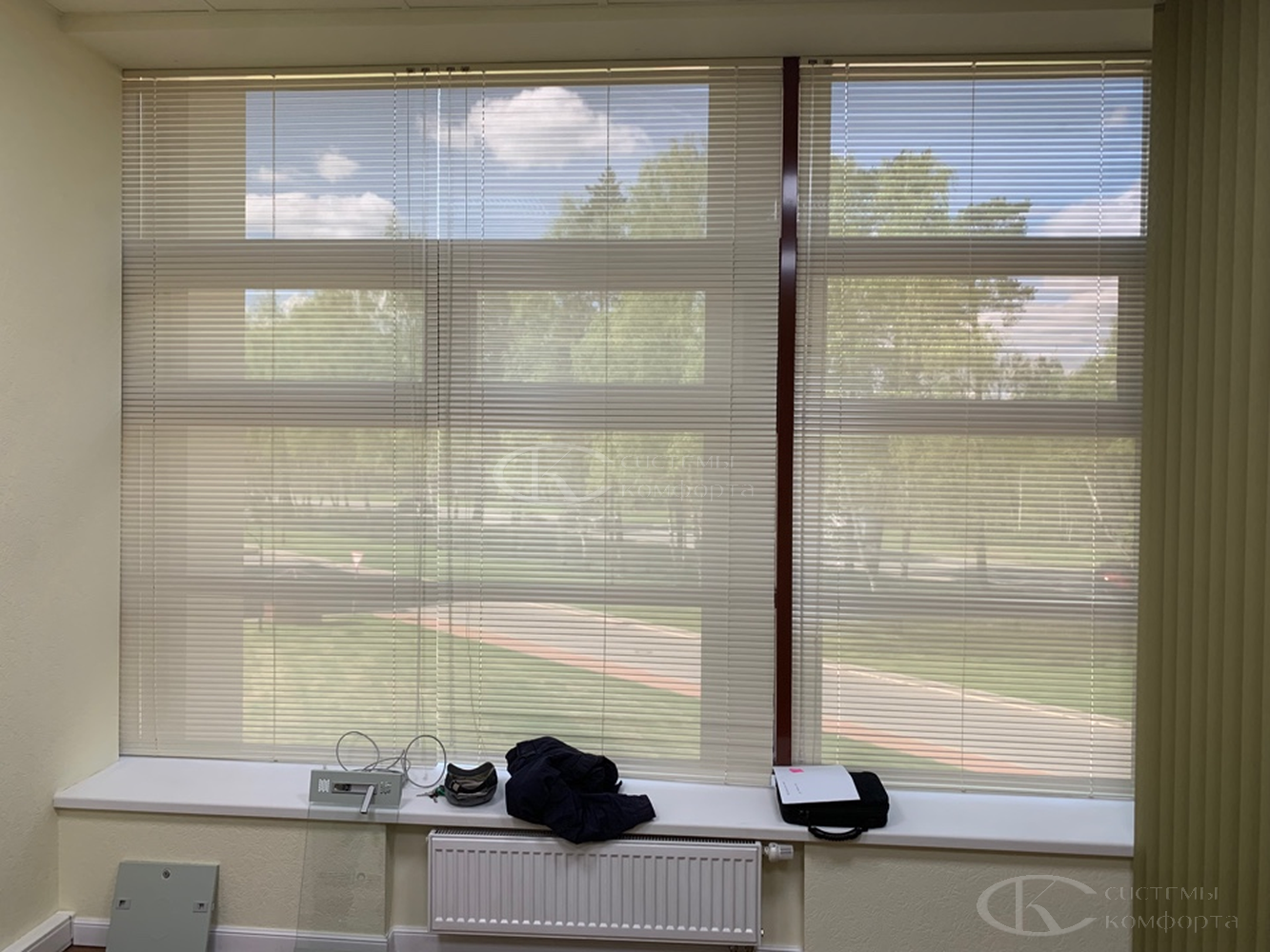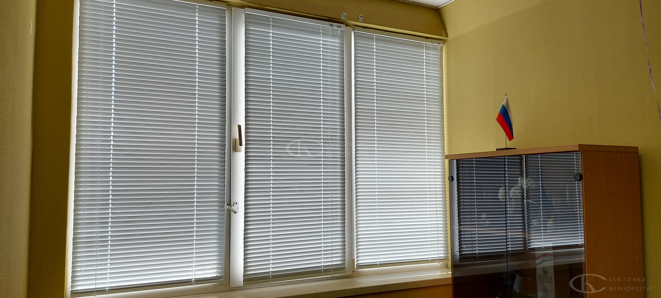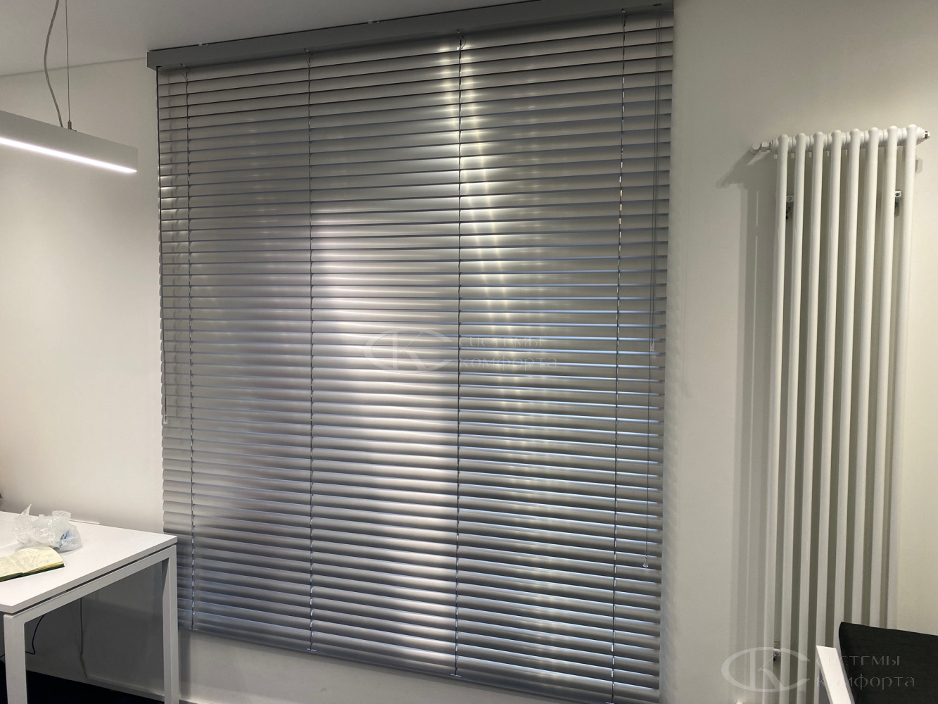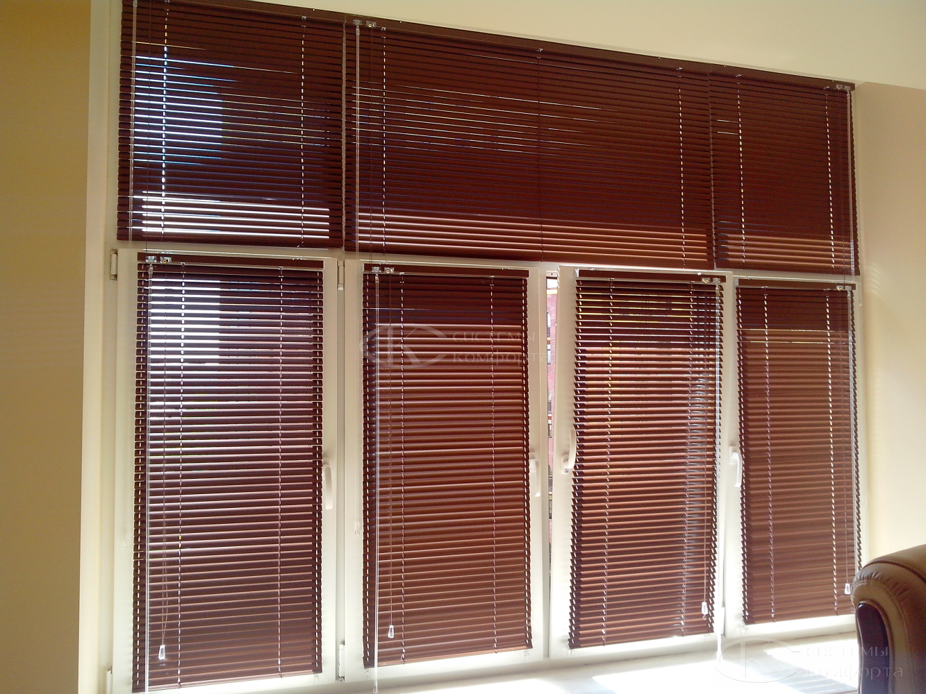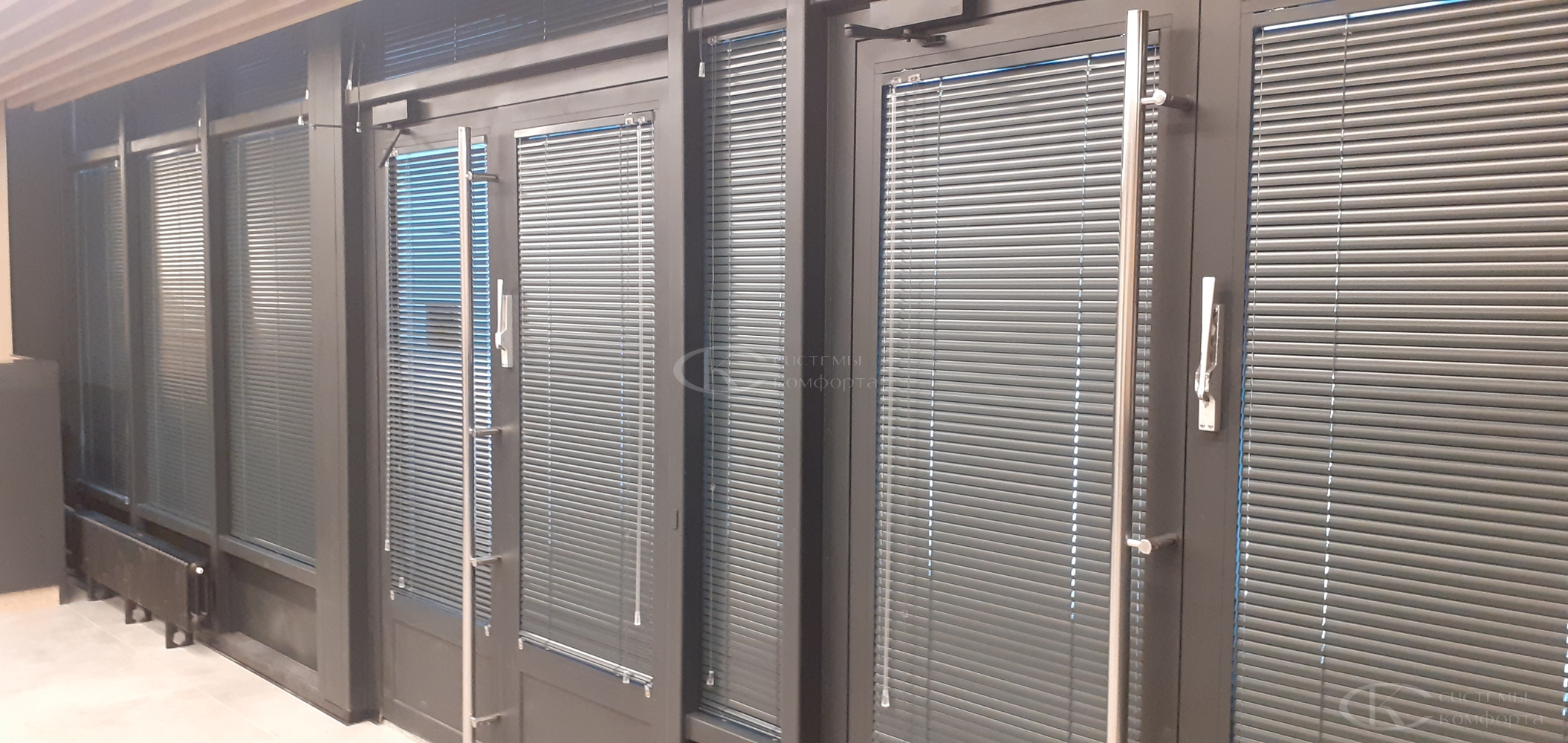 Компания «Системы комфорта» предлагает горизонтальные жалюзи с цветными алюминиевыми ламелями и перфорацией (опционально). Краска, которая используется в производстве, сертифицирована (экология), не выгорает на солнце и не истирается весь срок службы изделия.